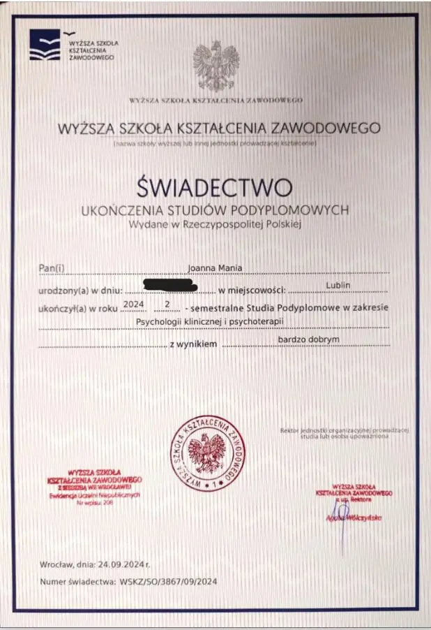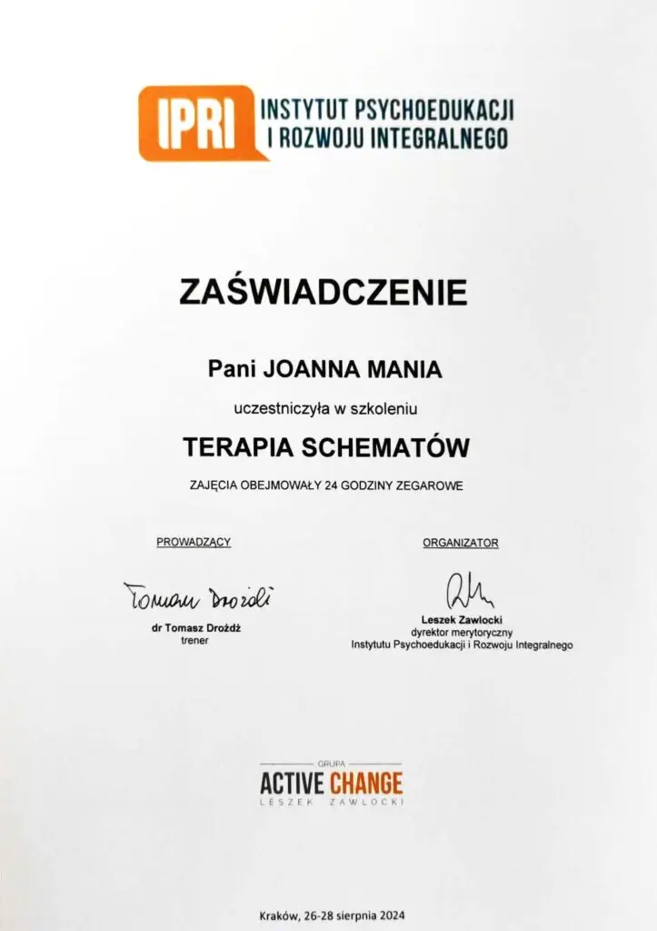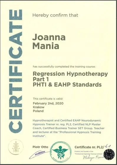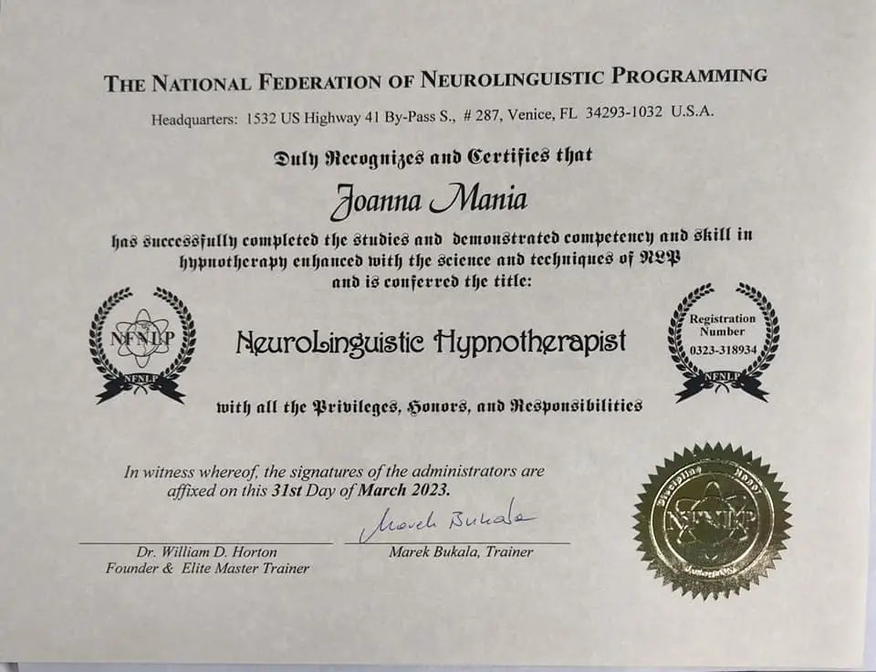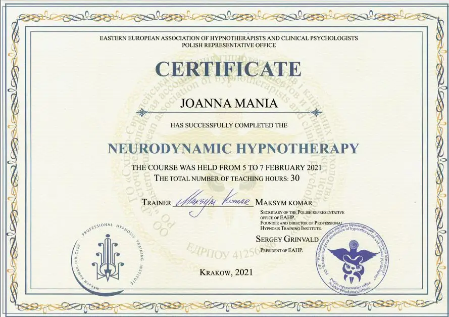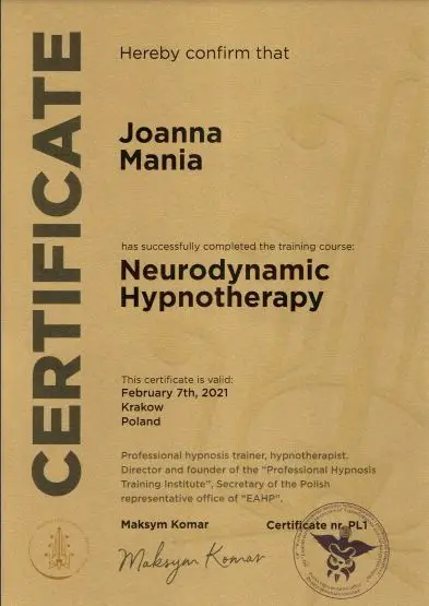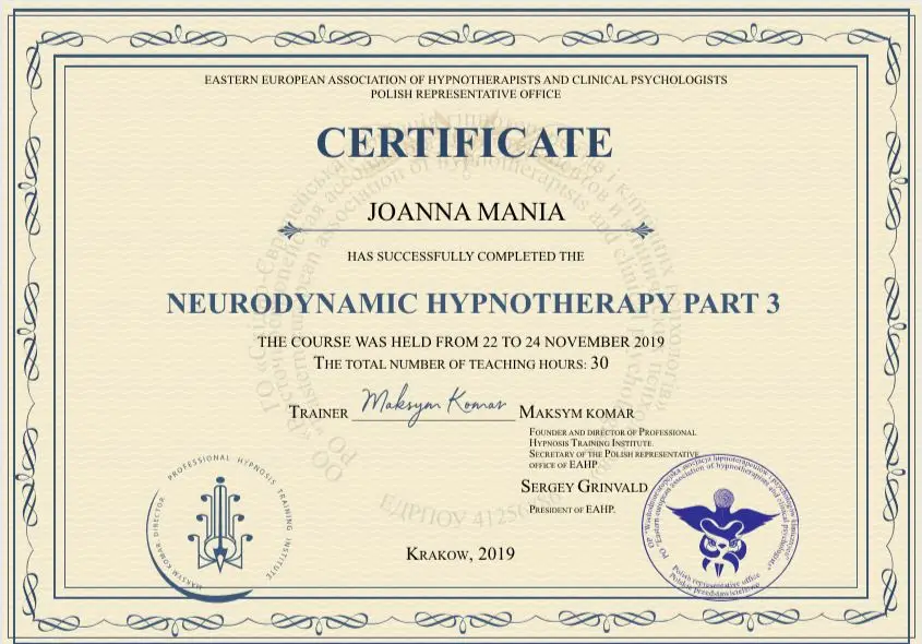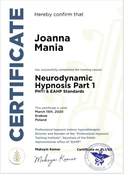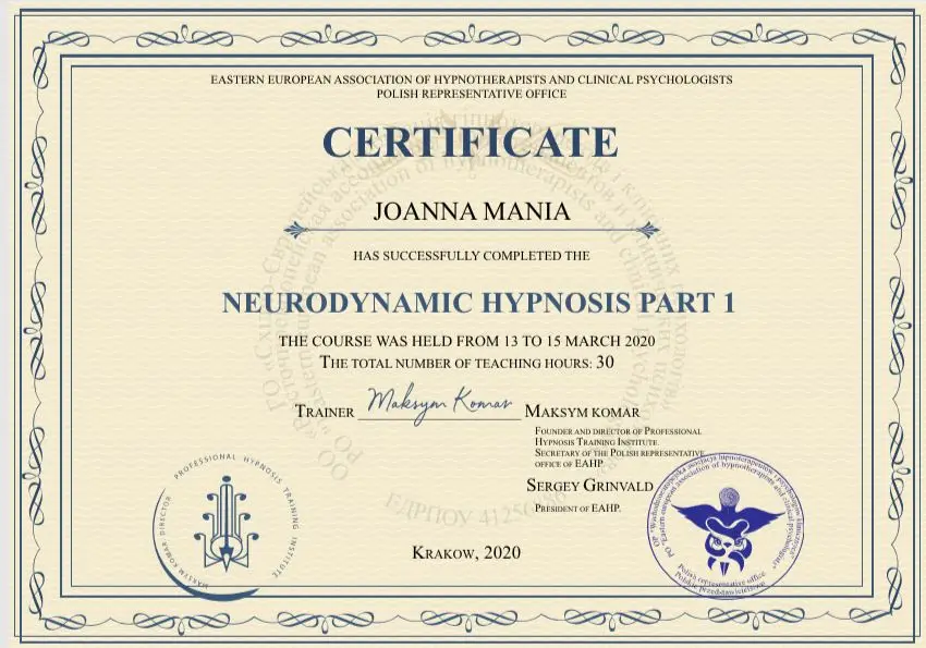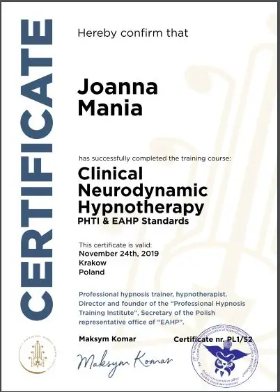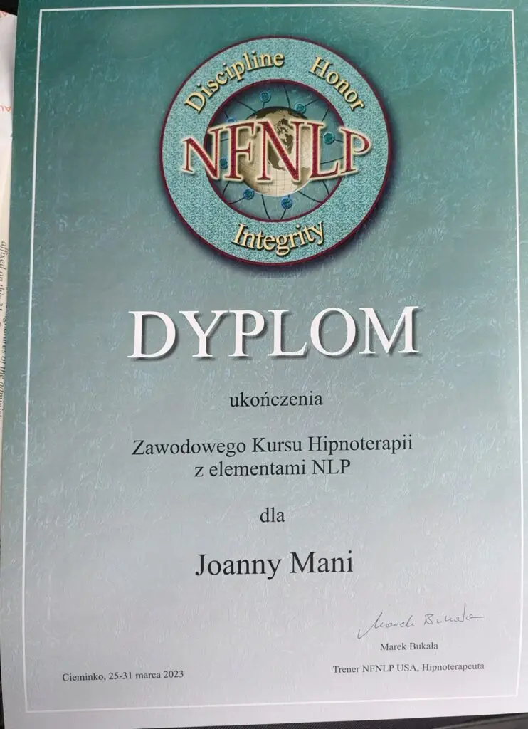 Joanna Mania– terapeuta, coach, certyfikowany hipnoterapeuta zrzeszony w The National federation of Neurolinguistic Programming z siedzibą w USA. Specjalizuję się w pracy z lękiem, poczuciem własnej wartości i zaburzeniami żywienia/odchudzaniem. Ukończyłam wiele kursów m.in. hipnozy klinicznej, regresyjnej , NLP, a także studia psychologii klinicznej i psychoterapii.