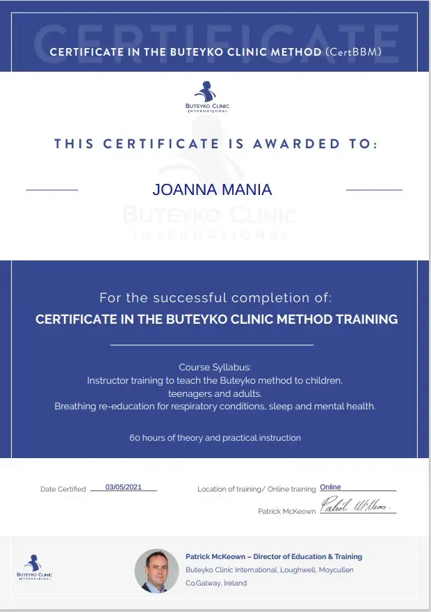 Posiadam również kwalifikacje Międzynarodowego Instruktora Buteyko Clinic (techniki oddechowe Butejki), dlatego w mojej pracy bardzo dużą uwagę skupiam właśnie na nawykach oddechowych, gdyż mają one wpływ na zdrowie fizyczne i psychiczne, a nawet takie dolegliwości jak lęk, depresja, nerwowość, bezsenność i wiele innych.